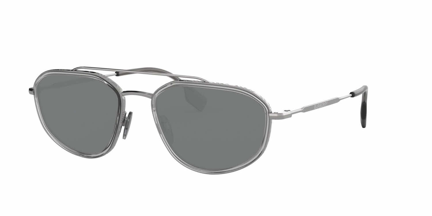 Launch a new fashion aesthetic wearing Burberry BE3106 prescription sunglasses for men. Noncorrosive and pressure-resistant metal ensures these navigator-style full-rim frames are strong and durable enough to handle your daily activities. A double bridge reinforces the frames while calling attention to the unique look of these glasses. Subtle angles in the rounded lenses help create a profile that complements heart-shaped faces. Adjustable nose pads and coated temple tips keep these distinctive Burberry prescription sunglasses securely and comfortably in place. The skull temples, which curve over the ears, also help keep the frames from slipping.